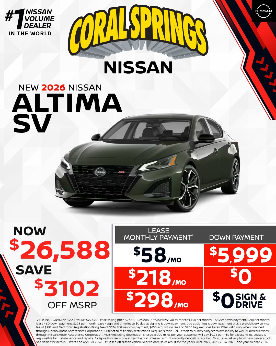 All pricing is for in-stock units only. All new vehicle pricing includes $1,500.00 financing credit through dealers preferred lender. Residency Restrictions apply. Special APR offers are for well qualified buyers with Tier 1 approval through NMAC. Offers are not combinable with any other offers or purchase programs. Must Finance with dealers Preferred lender (Non Special APR.) We strive to make sure all pricing and incentives are correct however errors do occur and we are not responsible for any errors that may be displayed on our site or any 3rd party site. Please contact dealer for complete offer details and any other questions. Pricing DOES NOT include: $992 Dealer Services Fee , Tax, Title, $574 E-File Fee, Registration, or $695 Lease Acquisition fee (if applicable.) Incentives and special APR available are only for the date shown and are subject to change at anytime without notice. Offer expires at month end, please see dealer for details. Prices and payments may not include an optional $1,598 Coral Springs Advantage Package.. .